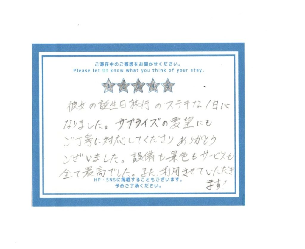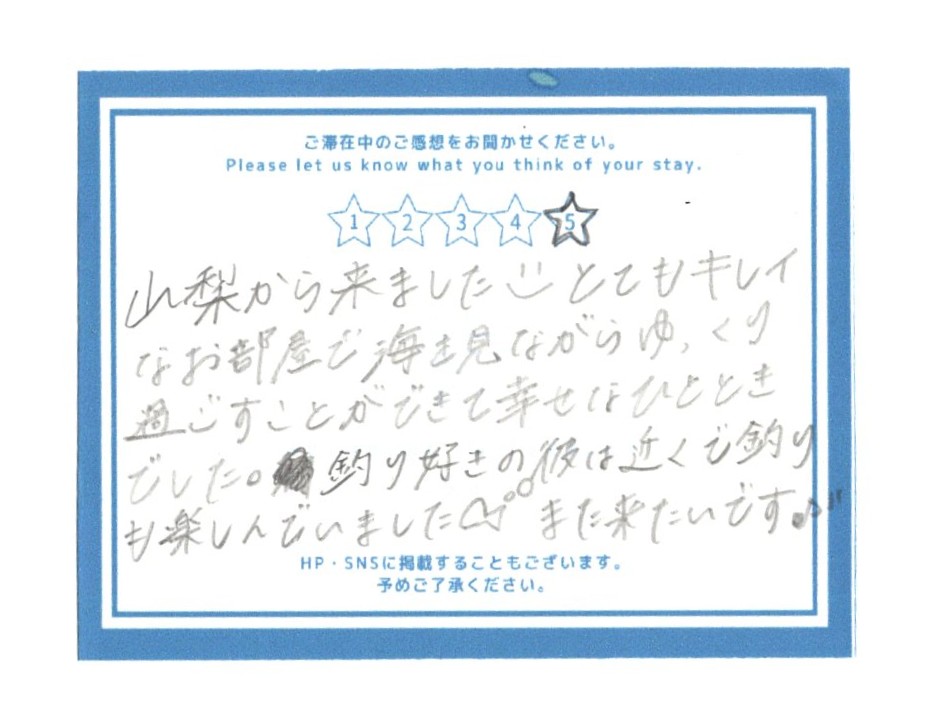 / ・旅行時期:この度は山梨県よりお越しいただき、誠にありがとうございました! 海を眺め…宿泊 訪問シーン:友人・知人と